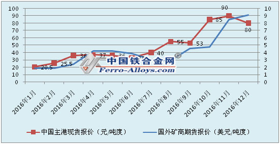 2016年,主流锰矿46%澳块现货价格从年初的20.5元上涨到12月底的80元/吨度,涨势惊人,有业内人士评论说,2016年的中国锰系铁合金市场上,真正得利的是国外矿山,对中国企业不公平。