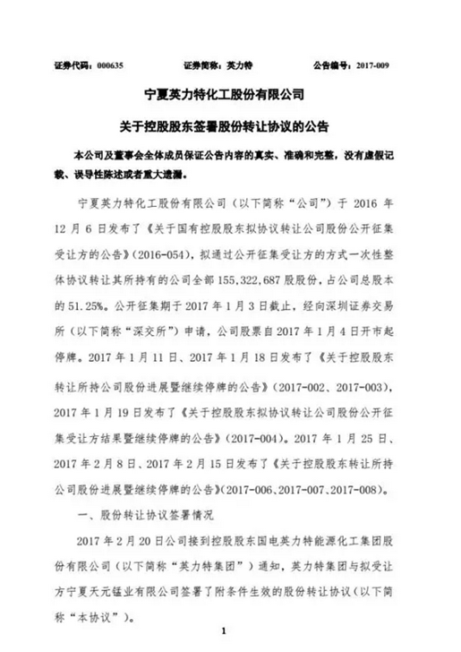 昨日,宁夏英力特化工股份有限公司发布【关于控股股东签署股份转让协议的公告】:2017 年 2 月 20 日公司接到控股股东国电英力特能源化工集团股份有限公司(以下简称“英力特集团”)通知,英力特集团与拟受让方宁夏天元锰业有限公司签署了附条件生效的股份转让协议。