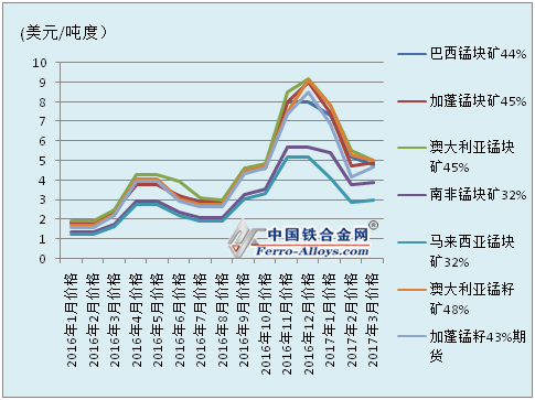 锰矿市场从1月——2月期间,主流锰矿从9.5美元/吨度下跌到4.5美元/吨度,下跌了近45%。现货市场也是从85元/吨度,下跌到45元/吨度。近日,由于现货、期货市场的活跃和价格的反弹,锰矿价格也开始一改颓势,绝地反弹。BHP澳块上周报价48—49元/吨度,本周上涨到53-54元/吨度。OM公司高碳锰渣25-28%也从上周的32元/吨度上涨到了本周的36-38元/吨度。