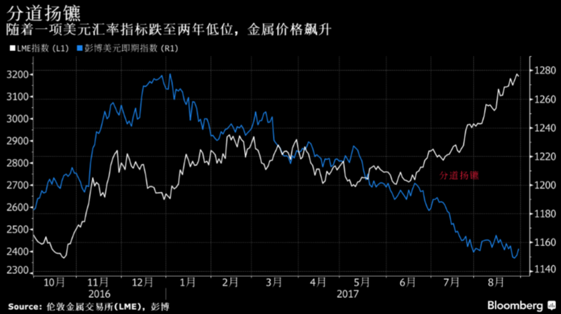 摩根士丹利分析师在近期的研究报告中指出,美元与金属之间典型的逆相关性又回来了,意味着金属价格易于受到美元反弹的冲击。在唐纳德·特朗普当选美国总统之后的几个月中,二者联袂走高,当时市场对于特朗普税改及基建计划的乐观情绪高涨。该行指出,但是随着特朗普议程的停顿,只有美元走软,才使得诸如铜、铝和铅等金属价格保持在高位,而非基本面使然;美元走软之时,会使得以其他货币表示的大宗商品价格显得便宜。(来源:彭博)