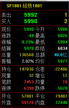 中国铁合金网讯:2017年10月17日上午15:30,硅铁1801合约收盘价5990,开盘价5988.最高价6026,最低价5904,跌幅0.73%,成交量136568手。