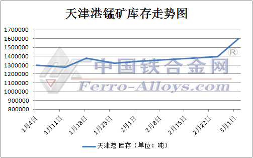 因3月钢招预期涨幅不大,锰矿现货市场再度上涨存阻力及压力,港口锰矿价格本有趋于平缓的态势,然而此次矿山再度报出高价格的操作一出,锰矿现货市场再度陷入僵局,报价再度上涨的势头显现。目前港口锰矿商们整体处于观望态势,在外盘的再度上涨消息的带动影响下,现货有继续上调的趋势。附:天津港锰矿库存图