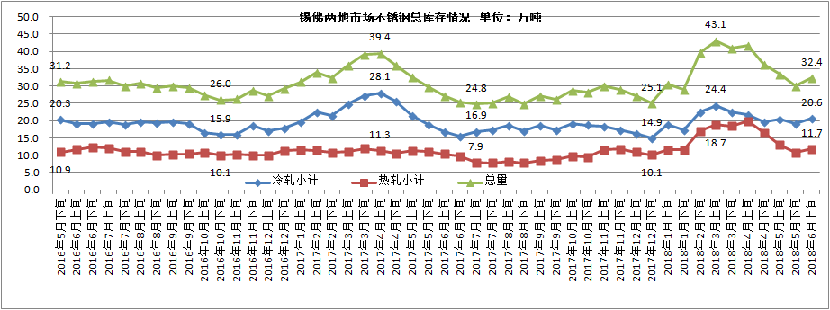 【中国铁合金网讯】6月中旬无锡和佛山两地不锈钢市场总库存32.4万吨,环比5月底增加2.3万吨;其中冷轧增加1.4万吨至20.6万吨,热轧增加0.9万吨至11.7万吨。另外,无锡电子盘可交割库存量上涨1万吨至4.7万吨,不包含于统计范围内。