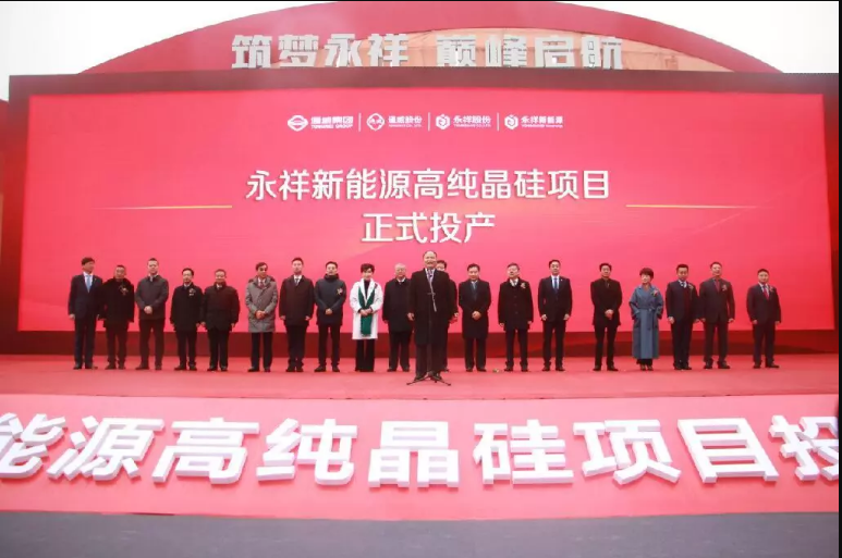 12月28日,永祥新能源高纯晶硅项目投产仪式在乐山市五通桥区隆重举行。中国有色金属工业协会副会长、硅业分会会长赵家生,乐山市委副书记曾洪扬,市委常委、常务副市长黄平林,市委常委、政法委书记廖磊,市政府副市长廖克全,十一届全国政协常委、全国人大代表、通威集团董事局刘汉元主席,乐山市五通桥区委书记张国清、区长李良,亚洲光伏协会会长、协鑫集团董事长朱共山,天津中环电子信息集团有限公司总经理、天津中环半导体股份有限公司董事长兼总经理沈浩平,隆基绿能科技股份有限公司总裁李振国,大全集团有限公司总裁徐翔,通威集团管亚梅董事长,通威集团禚玉娇总裁,通威股份副董事长严虎,通威股份总裁郭异忠,通威股份董事、永祥股份董事长兼总经理段雍等领导及嘉宾出席,合作伙伴、投资券商、主流媒体及永祥股份主要管理班子和员工代表近600人共同见证永祥发展历程中的又一重大时刻。