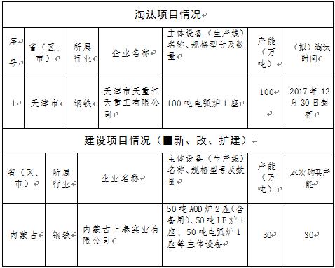 按照《国务院关于化解产能严重过剩矛盾的指导意见》要求,我厅于2017年12月27日对内蒙古(奈曼)经安有色金属材料有限公司、内蒙古上泰实业有限公司、内蒙古航丰特种合金有限公司等三家企业建设项目产能置换方案予以公告。由于上泰实业有限公司建设项目核定产能发生变化,现将调整后的产能置换方案进行公告,置换产能已列入天津市淘汰计划。