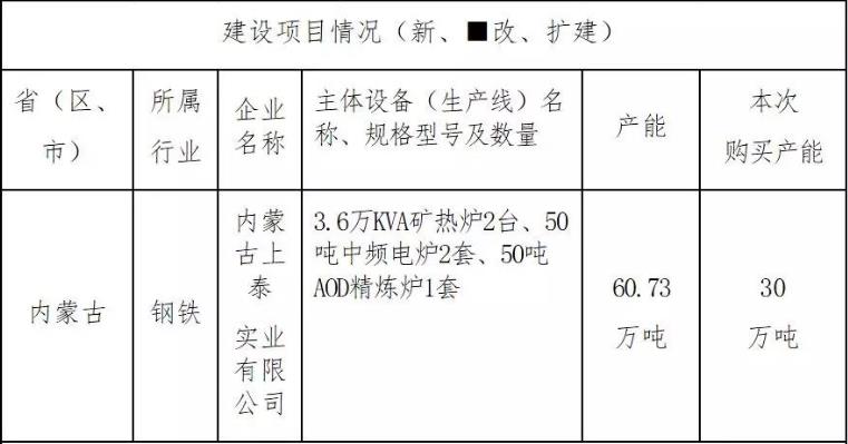 与之前公告的产能置换方案相比,内蒙古上台本次购买产能仍为30万吨不变,变化的主要为两方面:以是建设项目由此前的“改建建设60.73万吨的产能”变为“新建30万吨产能”,建设的主体设备则由“3.6万KVA矿热炉2台、50吨中频电炉2套、50吨AOD精炼炉1套”变为“50吨AOD炉2座(含备用)、50吨LF炉1座、50吨电弧炉1座等主体设备”。