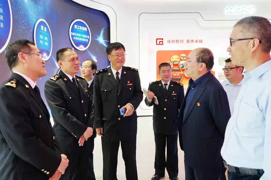 在多功能展厅,通过公司宣传视频和工艺流程视频,王磊向一行人员汇报了公司近年来的生产运营、工艺技术以及生产原材料进口等方面的情况,并代表公司对阳江海关一直以来的大力支持表示感谢。他表示:广青科技将继续以习近平新时代中国特色社会主义思想和习近平总书记视察广东重要讲话精神为指引,充分发挥自身工艺优势,不断提升创新能力,深化企业社会责任,为阳江经济发展贡献更大的力量。
