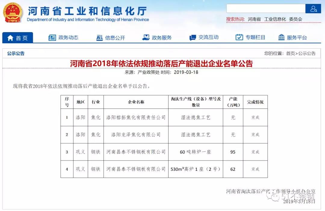 【中国铁合金网讯】据河南省工业和信息化厅3月18日消息,河南省2018年依法退出不锈钢产能157万吨,主要为“河南昌泰不锈钢板有限公司”60吨转炉1座(产能95万吨)、530m³高炉1座(2号)(产能62万吨)。