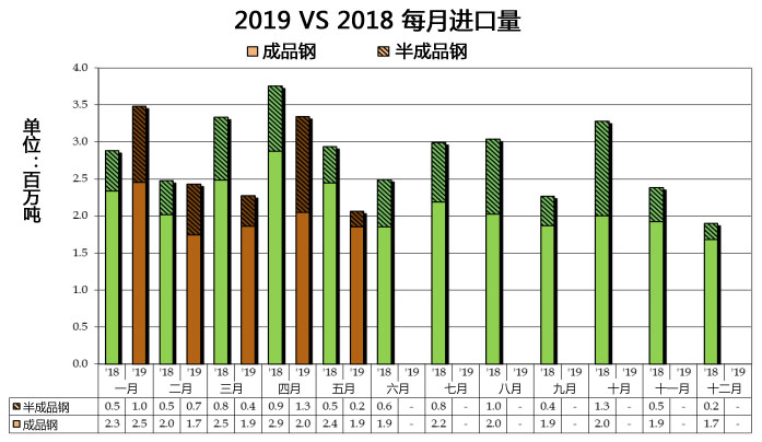 5月份,成品钢离岸进口国分别为南韩(29万吨,比四月底上涨5%)、日本(12.4万吨,下降22%)、台湾(8.1万吨,上涨13%),德国(6.4万吨,下降56%)和越南(6.1万吨,下降23%)。1-5月份,最大的离岸供应国家为南韩(128.7万吨,较2018年同期下降16%)、日本(61.1万吨,没有变化)、德国(51.7万吨,下降6%)、台湾(43.6万吨,下降7%)和越南(36.8万吨,下降5%)。
