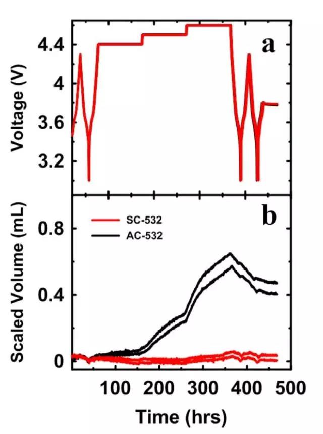 近年来,随着动力电池能量密度的持续提升,能量密度更高的软包电池的市场份额也在逐年扩大,相比于硬壳电池,软包电池对于材料产气更加敏感,因此产气量也是衡量材料稳定性的重要指标之一。通过浮充实验能够发现,单晶材料产气量非常小[5],在4.4V、4.5V和4.6V电压下浮充100h的产气量仅为0.01、0.01和0.04ml,而同样条件下Al2O3包覆的二次颗粒NCM523材料电池的产气量则分别达到了0.07、0.27和0.62ml,这再次表明单晶材料在产气上具有较大的优势。