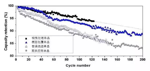 单晶材料良好的结构稳定性使得材料具有非常好的循环稳定性,以单晶NCM523为例,在40℃下循环300次(3-4.4V,C/2)后,单晶NCM523材料电池的容量保持率仍然可达98%,但是即便是通过Al2O3包覆处理的二次颗粒NCM523材料的容量保持率也仅有92%[5],在55℃高温条件下,这一差距将更加明显(单晶>94%,二次颗粒<85%)。