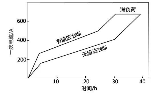 上图所示为12.5MV•A矿热炉焦炭焙烧电极的开炉过程送电制度示意图。送电初期,负荷不宜过大,适当延长达到50%额定电流的持续时间。在烘炉送电和投料的初期,焦炭和料层厚度较薄,电极的消耗速度较快。由于焦炭焙烧的电极长度有限,升负荷时间过长会造成电极工作端长度不足。因此,应尽量缩短达到满负荷的时间,使电极消耗速度与负荷增长速度相匹配。