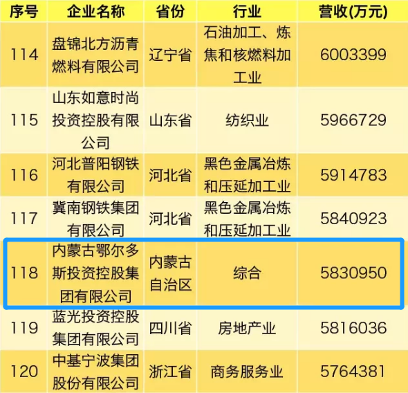 内蒙古鄂尔多斯投资控股集团有限公司以营业收入5830950万元位列榜单第118位。