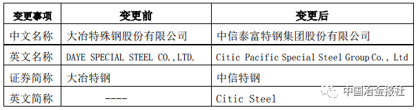 从公告中获悉,鉴于大冶特殊钢股份有限公司实施以发行股份形式购买兴澄特钢86.5%股权的重大资产重组方案,实现中信集团特钢板块整体上市,中国证监会已经核准,拟对公司名称及证券简称进行变更,由“大冶特钢”变更为“中信特钢”(以工商行政管理部门最终核准的公司名称为准),具体拟变更情况如下:
