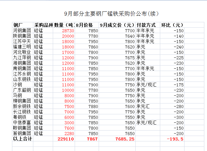 中国铁合金网讯:2019年9月份主要钢厂硅锰采购价格 “靴子”落地。具体采购价格如下: