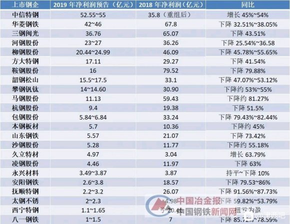 在目前已公布2019年业绩(包括正式公布和预告)的23家钢企上市公司中,除中信特钢、久立特材、西宁特钢外,大部分企业表示业绩将出现下滑,最高下滑幅度超过90%。