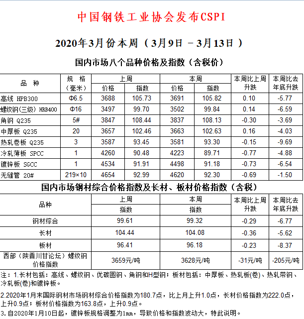 3月9日-3月13日国内市场八个品种价格及指数(含税价)