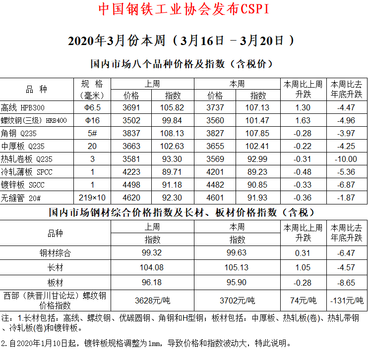 3月16日-3月20日国内市场八个品种价格及指数(含税价)