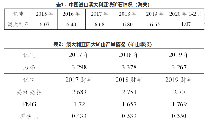 2019年,中国自巴西进口铁矿石共计2.28亿吨,同比减少600万吨,占全年进口总量的21.33%。根据矿山季报,2019年,淡水河谷铁矿石产量3.02亿吨,同比下降21.5%,主要是溃坝事故影响产能9300万吨。2020年1-2月,中国自巴西进口铁矿石3607万吨,同比减少558万吨,主要原因在于2019年淡水河谷溃坝事故对其供应的影响自当年4月份开始显现,一季度以消耗港口库存为主,基数仍较高。而2020年1-2月份,受连续暴雨天气、港口频繁检修影响,其发运量出现回落。预计二季度,淡水河谷发运量将随着天气的好转逐步恢复。