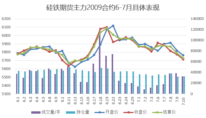 【期货行情】本周硅铁期货主力2009合约开盘价5,816,最高价5,928,最低价5,702,收盘价5,712,结算价5,726,持仓量32,669,成交量143,544。