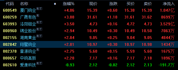 截止本周五收盘,钨上市公司涨多跌少,具体为:厦门钨业涨超4%,广晟有色、洛阳钼业涨近4%,锡业股份、湖南黄金、章源钨业均涨近3%,中钨高新涨超2%,爱康科技跌近1%。