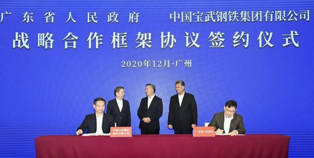 12月5日下午,广东省与中央企业合作发展座谈会暨战略合作框架协议签约仪式在广州举行。在中共中央政治局委员、广东省委书记李希,广东省委副书记、省长马兴瑞,中国宝武党委书记、董事长陈德荣的见证下,广东省副省长王曦与中国宝武总经理、党委副书记胡望明在仪式上签署《广东省人民政府、中国宝武钢铁集团有限公司战略合作框架协议》。