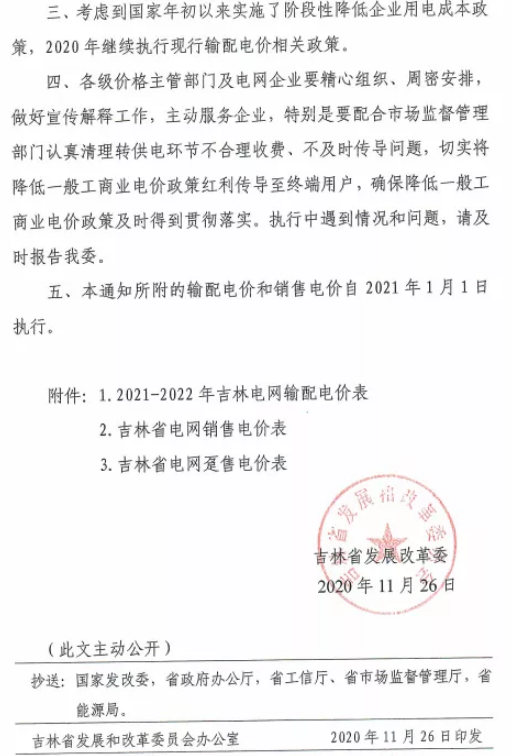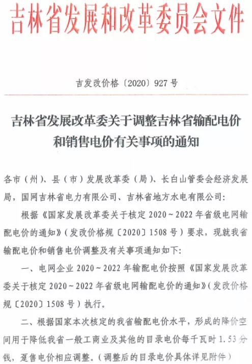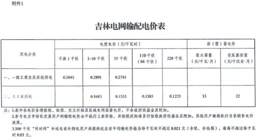 中国铁合金网讯:近日吉林省发改委发布《关于调整吉林省输配电价和销售电价有关事项的通知》,通知中称根据国家本次核定的吉林省输配电价水平,形成的降价空间用于降低一般工商业及其他的目录电价每千瓦时1.53分钱,趸售电价相应调整。