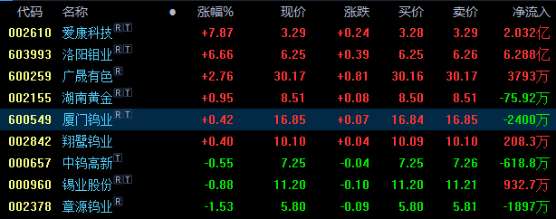 截止本周五收盘,钨上市公司涨多跌少,具体为:爱康科技涨超近8%,洛阳钼业涨近7%,广晟有色涨近3%,湖南黄金涨近1%,厦门钨业、翔鹭钨业涨幅不足1%,中钨高新、锡业股份跌近1%,章源钨业跌近2%。
