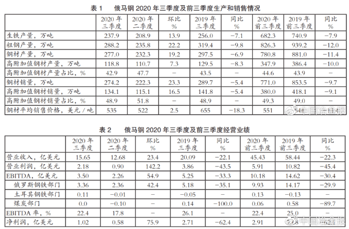 俄罗斯马格尼托哥尔斯克钢铁公司(MMK,简称俄马钢)公布的2020年三季度财务报告显示,三季度受益于俄罗斯国内市场钢材需求增长以及2号高炉完成停产检修之后恢复生产,该公司生铁产量由二季度的209万吨环比大幅增长13.9%至238万吨,与2019年三季度的256万吨相比则减少7.1%;受生产逐步恢复和产能利用率提高推动,其粗钢产量由二季度的236万吨环比显著提高22.2%至288万吨,与2019年三季度的319万吨相比则下降9.8%;受益于2500mm热轧机完成重建后恢复生产,其钢材产量由二季度的232万吨环比大幅增加19.2%至277万吨,与2019年三季度的298万吨相比则下滑6.9%,其中,高附加值钢材产量由二季度的111万吨环比增长7.3%至119万吨,与2019年三季度的130万吨相比则减少8.3%,高附加值钢材产量占比由二季度的47.7%回落至42.9%,且低于2019年三季度的43.5%。三季度,俄马钢钢材销量由二季度的222万吨环比显著提高23.3%至274万吨,与2019年三季度的290万吨相比则小幅减少5.4%。其中,高附加值钢材销量由二季度的115万吨环比大幅增加16.5%至134万吨,与2019年三季度的142万吨相比则小幅下降5.4%;高附加值钢材销量占钢材总销量的比重由二季度的51.8%小幅下滑至48.9%,与2019年三季度相比保持基本稳定。