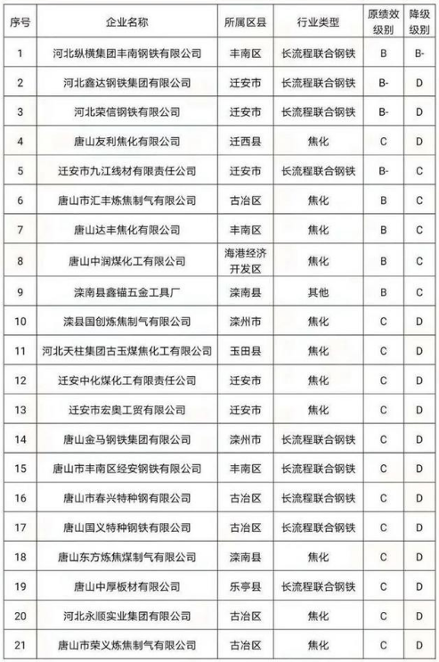 针对企业治理和管理等问题,3月份唐山市大气办对21家企业绩效等级降级,并予以公布: