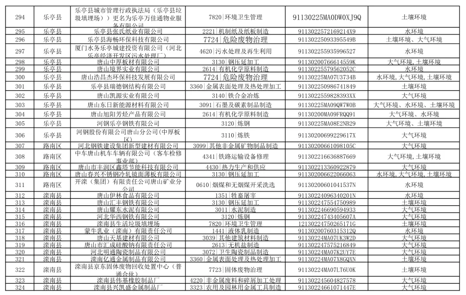 | 302 | 乐亭县 | 唐山凯源实业有限公司 | 3140|铁合金冶炼 | 9113022559828393XX | 大气环境 |