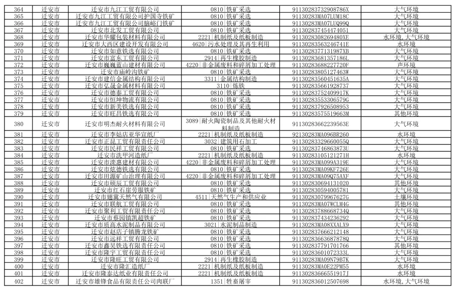 | 392 | 迁安市 | 迁安市聚利工贸有限责任公司 | 0810|铁矿采选 | 91130283788668734Q | 大气环境 |