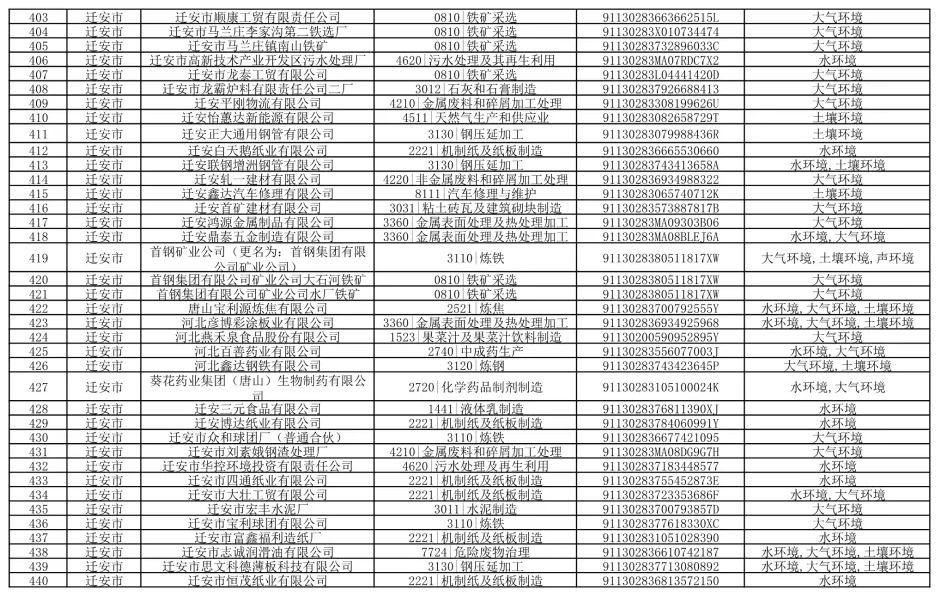 | 403 | 迁安市 | 迁安市顺康工贸有限责任公司 | 0810|铁矿采选 | 91130283663662515L | 大气环境 |