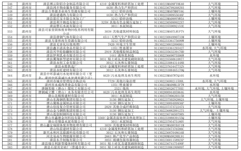 | 571 | 滦州市 | 唐山冀杨金属制品有限公司 | 3130|钢压延加工 | 91130223089409936P | 土壤环境 |