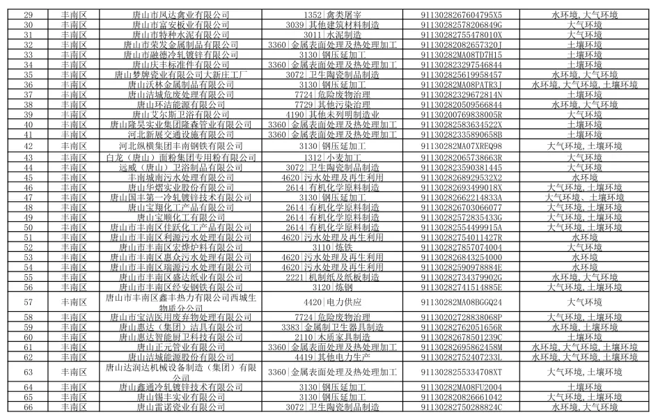 | 70 | 丰润区 | 唐山市丰丰冷轧带钢有限公司 | 3130|钢压延加工 | 911302217288356925 | 土壤环境 |