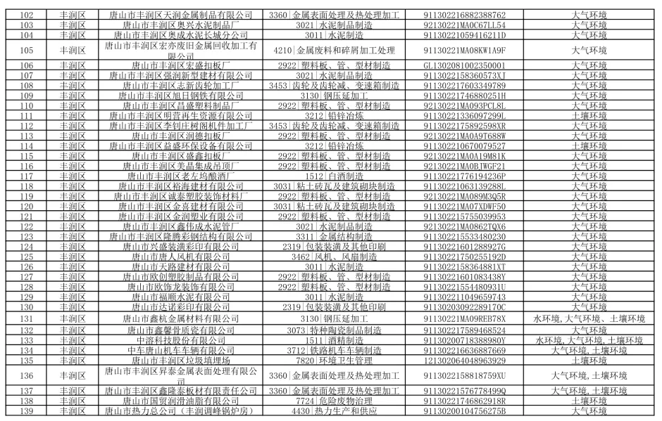 | 131 | 丰润区 | 唐山市鑫杭金属材料有限公司 | 3130|钢压延加工 | 91130221MA09REB78X | 水环境,大气环境、土壤环境 |