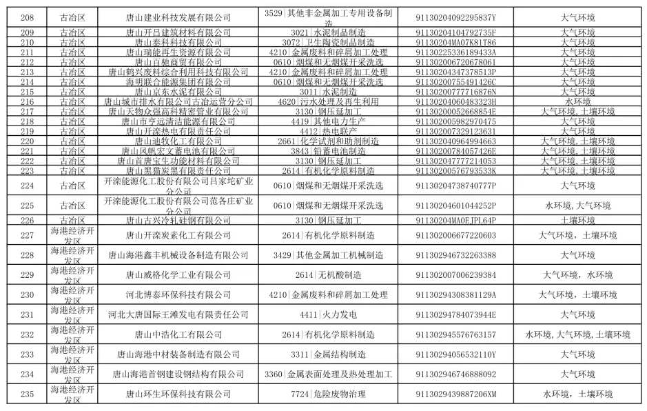 | 217 | 古冶区 | 唐山天物众强高科精密管业有限公司 | 3130|钢压延加工 | 91130200052668854E | 大气环境,土壤环境 |