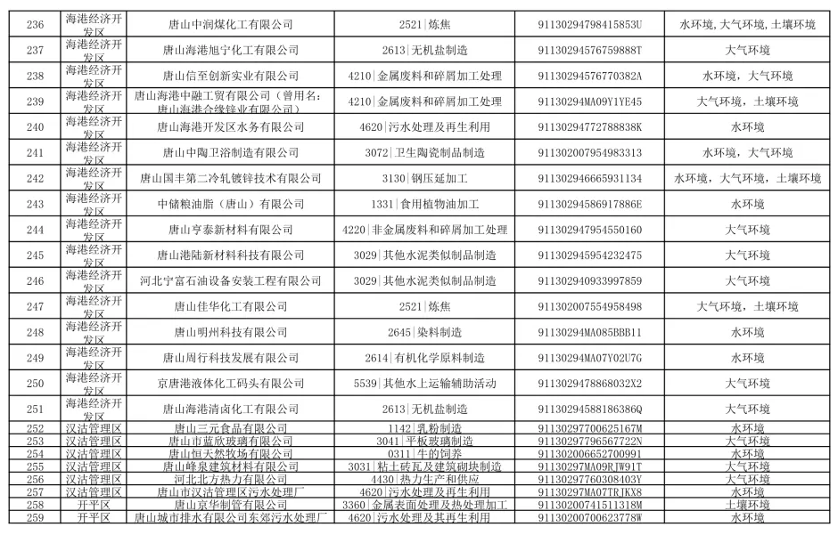 | 11 | 丰南区 | 唐山京津冷轧镀锌有限公司 | 3130|钢压延加工 | 91130282MA08MG9T2U | 水环境,大气环境、土壤环境 |