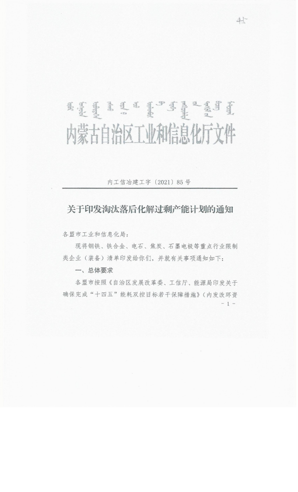 4月6日乌兰察布市发布关于印发淘汰落后化解过剩产能计划的通知:现将重点行业限制类企业(装备)清单公布,涉及乌兰察布市第一批铁合金29户,电石2户,石墨电极3户。其中铬铁企业19户,共涉及33台矿热炉,涉及产能约为80.6万吨。要求抓紧制定钢铁、铁合金、电石、焦炭、石墨电极等重点行业整合退出工作方案,明确2021-2023年每一年度具体计划,整合退出的80%以上任务要安排在前两年。