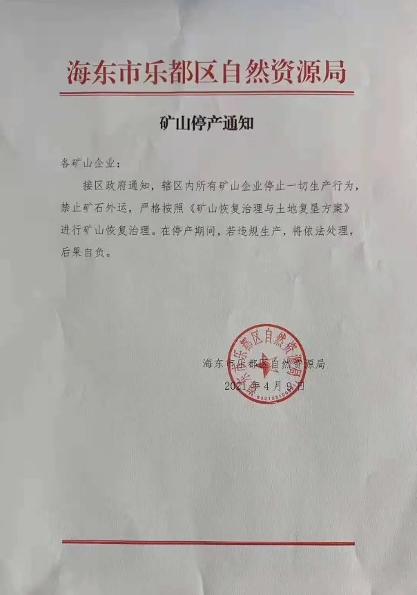 海东市乐都区自然资源局发布矿山停产通知