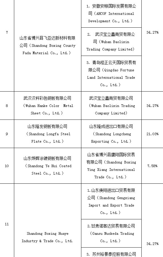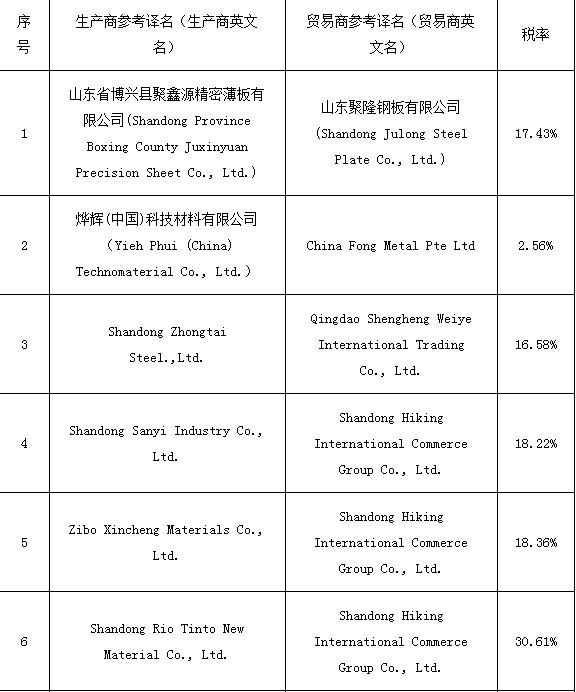 附表:越南对华彩涂钢板反倾销期中复审终裁结果: