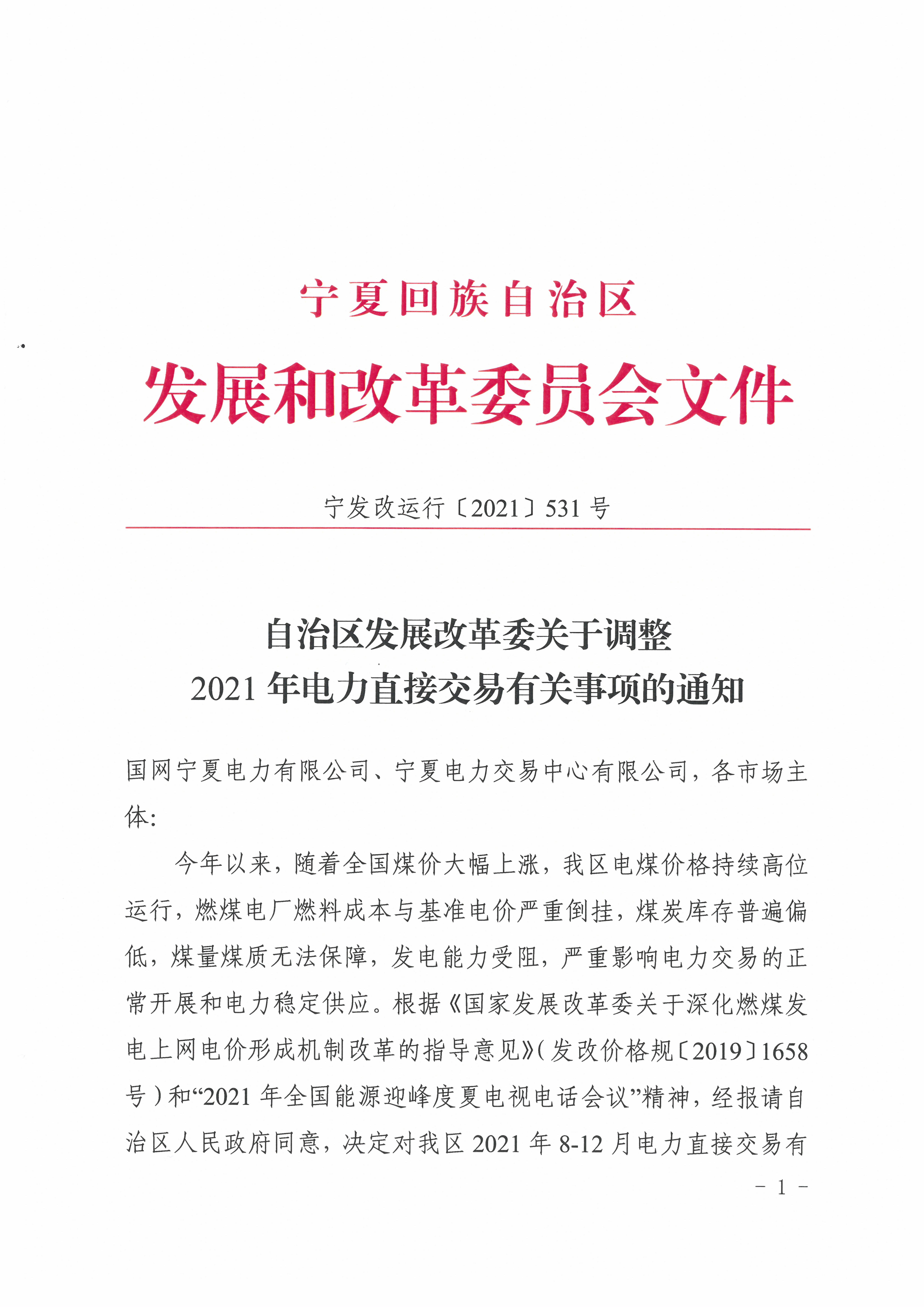 今年以来,随着全国煤价大幅上涨,我区电煤价格持续高位运行,燃煤电厂燃料成本与基准电价严重倒挂,煤炭库存普遍偏低,煤量牒质无法保障,发电能力受阻,严重影响电力交易的正常开展和电力稳定供应。根据《国家发展改革委关于深化燃煤发电上网电价形成机制改革的指导意见》(发改价格规[20191658号)和“2021年全国能源迎峰度夏电视电话会议”精神,经报请自治区人民政府同意,决定对我区2021年8-12月电力直接交易有关事项予以调整,现通知如下: