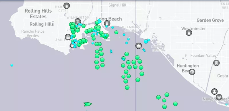下面是丹麦班轮咨询公司eeSea绘制的地图,上面显示了在这两个港口附近有大量集装箱船停泊。