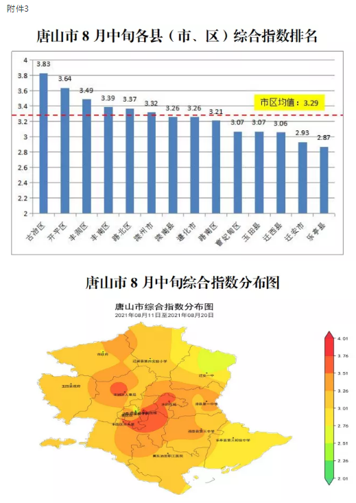 (三)重点污染区域。8月11日-20日,古冶区、开平区、丰润区、丰南区、路北区、滦州市等6个县(市、区)综合指数高于市区均值,高出市区0.54-0.03,是重点污染区域。其中,古冶区PM2.5、CO两项污染因子全市倒1,开平区NO2、PM10两项污染因子全市倒1,要重点加强管控。(见附件3)