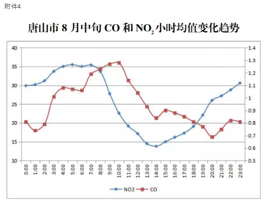 (四)重点污染时段。从8月11日-20日CO和NO2小时浓度均值变化情况看,整体呈白天较低,夜间升高的规律,其中,CO浓度3时-10时上升迅速,NO2浓度夜间20时-次日8时持续偏高,要重点加强排查,提出针对性管控措施。(见附件4)。
