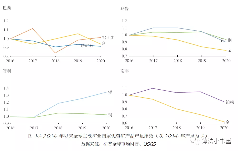 与 2019 年相比,2020 年澳大利亚煤炭、铁矿石、铜、金等矿产品产量下降,俄罗斯煤炭、石油、天然气、金、铂族等矿产品产量下降,巴西铁矿石、金等矿产品产量下降,秘鲁铜、金、铅、锌产量下降,智利铜产量下降,南非铁、锰、金、铂族等矿产品产量下降。