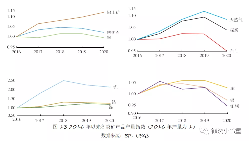 2020 年,全球煤炭产量同比下降 4.9%,石油下降 7.0%,天然气下降 3.1%,黄金下降 3.0%, 银下降 5.7%,铂族金属下降 8.0%,铁下降 2.0%,锰下降 5.6%,铜下降 2.0%,铝土矿产量逆势上涨 2.3%。