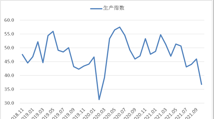 在钢铁压产和能耗双控等政策影响下,钢厂生产也继续下降。月初多地出现限电限产问题,对生产影响较为明显,中旬能源紧张问题虽有所缓解,但能耗双控政策依然稳步推进,压产政策严格执行,加上冬季环保限产即将来临,企业对生产持有谨慎心态,10月份整体产量有一定下滑。生产指数为36.8%,环比下降9.2个百分点,连续第4个月保持在收缩区间,且为近20个月以来新低,显示生产存在趋势性放缓。据中钢协数据统计,截止10月中旬,重点统计钢铁企业累积日产粗钢188.25万吨,环比下降2.75%,同比下降13.45%;日产生铁166.83万吨,环比下降5.12%,同比下降13.20%;日产钢材183.80万吨,环比下降3.81%,同比下降12.40%。生产下降带动钢厂原材料采购活动下滑,采购量指数为37.0%,环比下降2.7个百分点,连续三个月位于40%以下。