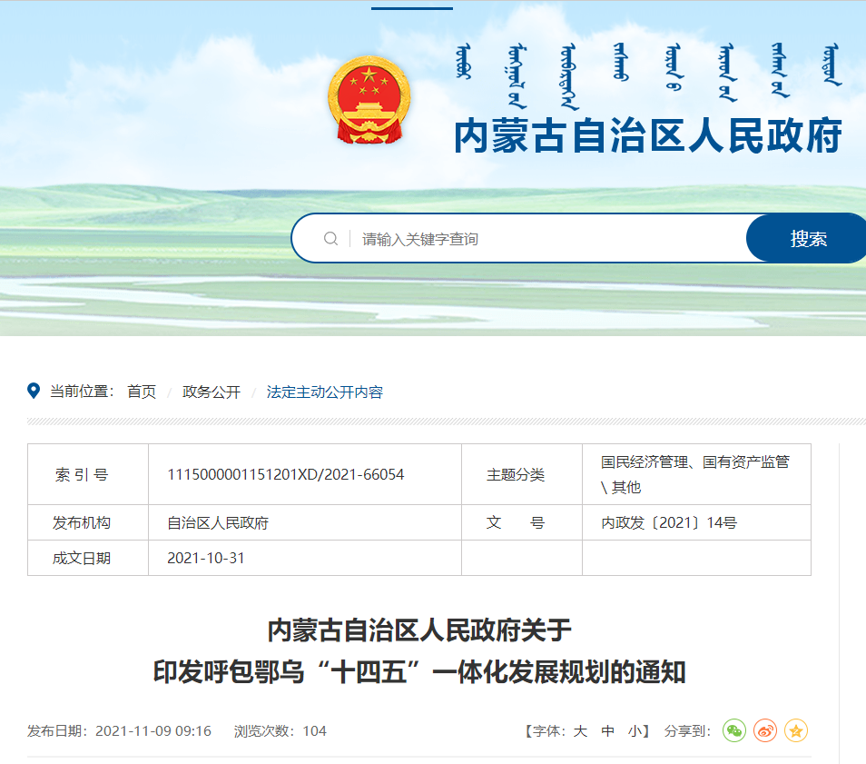 中国铁合金网:内蒙古自治区人民政府关于印发呼包鄂乌“十四五”一体化发展规划的通知