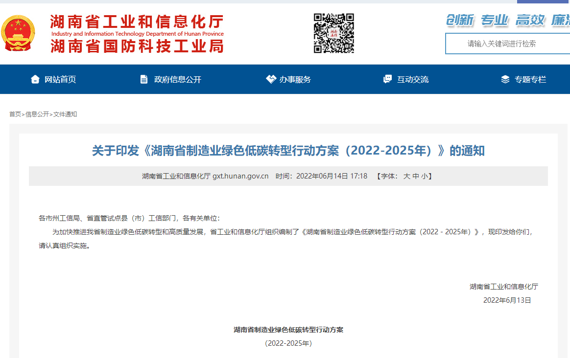 为加快推进我省制造业绿色低碳转型和高质量发展,省工业和信息化厅组织编制了《湖南省制造业绿色低碳转型行动方案(2022-2025年)》,现印发给你们,请认真组织实施。